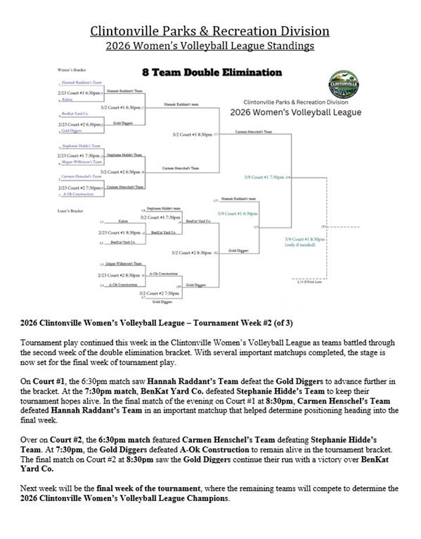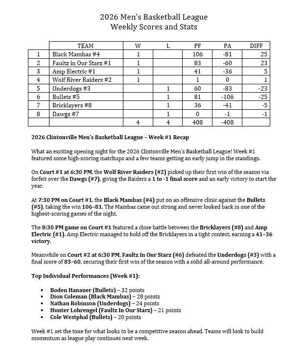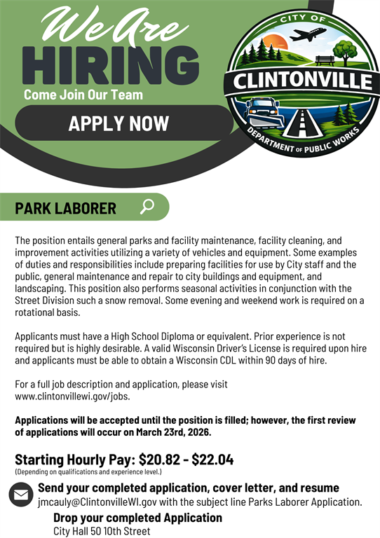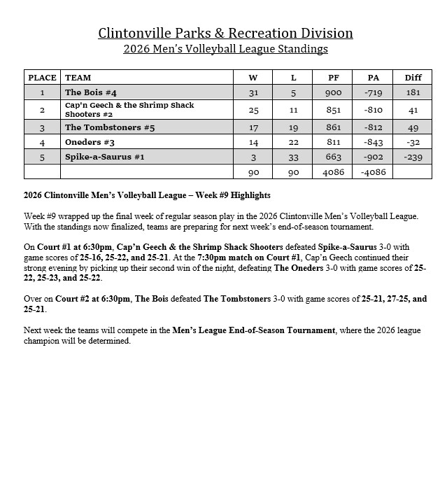 Clintonville has two community parks and thirteen neighborhood parks/greenspaces. In addition, there are three boat landings with one at Ice House Landing near Hemlock and N. 12th Streets, one at Pigeon Lake Wayside near Mathew's Supper Club, and one at Pickerel Point Memorial Park off West street. The department provides many opportunities for people young and old to participate in recreational activities. There are a wide variety of classes and programs offered by the department. Clintonville owns and operates the Community/Senior Center at 30 S. Main Street. There are five outdoor shelters and one newly renovated indoor shelter that can be rented by the public. The Jim Simpson Memorial Disc Golf Course, a nine basket par 3 course which opened in the Fall of 2013, is also available to the public in W.A. Olen Park.